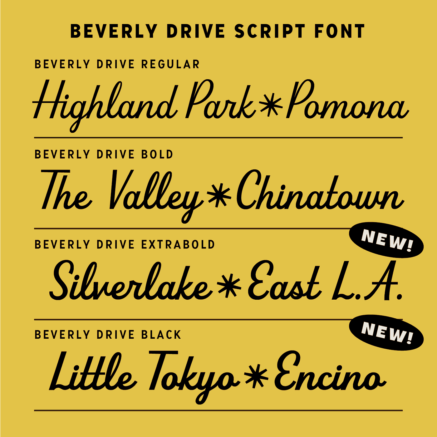 Selected as one of the first for this list of 2024 fonts, another gem from Hoodzpah. Next to beauties such as Beale, Chapman Ave, and Venice Blvd they have built the stunning script font Beverly Drive. We’re big fans of script fonts and we have to say that Beverly Drive is one of the best script fonts out there.