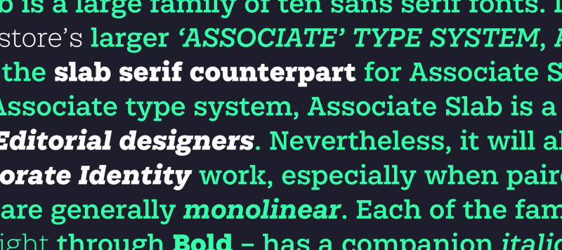 The combination of sturdy, readable letterforms and an extensive range of weights ensures it's adaptable for both headlines and body text. With Associate Slab, you can give your designs a sense of authority and clarity, making it a valuable addition to any designer's toolkit.
