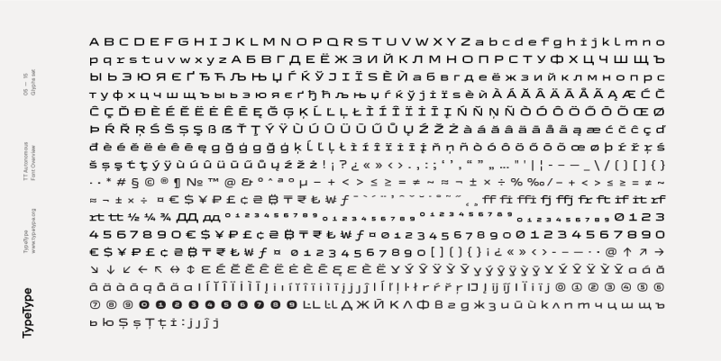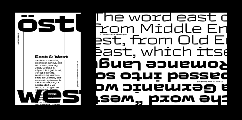TT Autonomous Mono was designed by Anna Tikhonova, Antonina Zhulkova, Eugene Tantsurin, and Yulia Gonina from TypeType. The team from TypeType describes the birth of the idea of this typeface: “The idea was born in Amsterdam when one of our colleagues took the official electric taxi at the Schiphol airport. At the moment we were thinking about creating a new wide sans serif, and an interesting question emerged during the trip: what font would be associated with autonomous electric transport? Then we thought it would also be nice to expand this theme visually.”