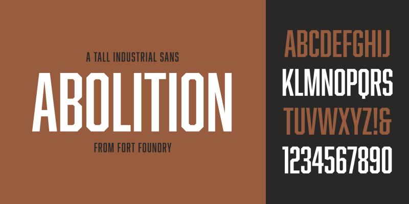 With its distinctive letterforms, Abolition stands out, commanding attention and delivering a powerful aesthetic. The variety of weights and styles offers creative flexibility, making it suitable for a range of projects. If you're in search of a typeface that combines contemporary impact with a timeless edge, Abolition is a font that definitely leaves a strong impression.