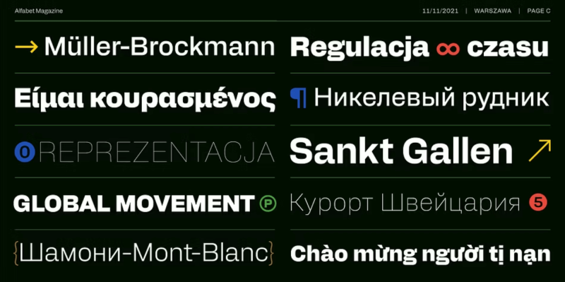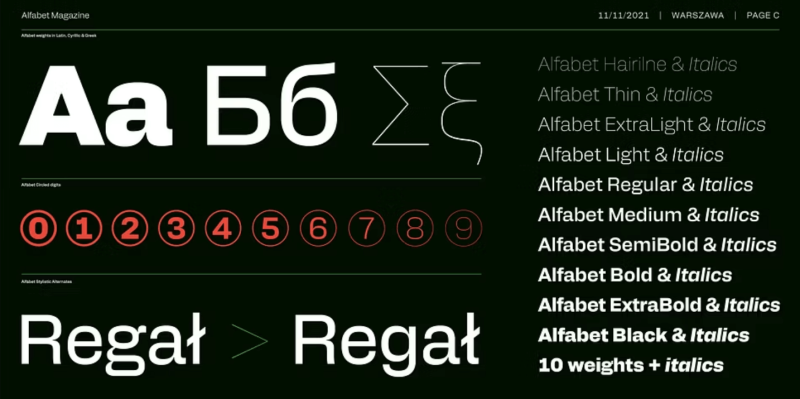The whole type family will work wherever we want to emphasize modernity and a rational way of visual thinking. Alfabet is the perfect choice for multiscript branding purposes, all styles support Latin, Greek, and Cyrillic scripts.