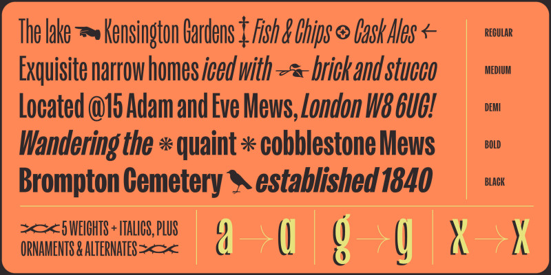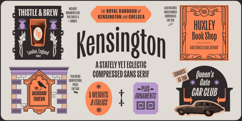 Its refined appearance suits various styles, from classic to contemporary. Multiple weights and styles, along with OpenType features, give you the tools to create designs that bridge the gap between nostalgia and modern design. Kensington is a wonderful choice for designers seeking for some sophistication and typographic excellence in their work.