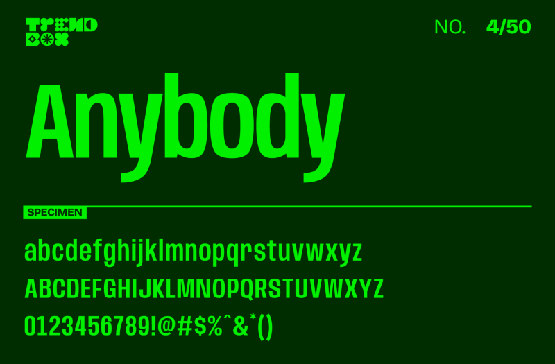 Anybody is a unique sans-serif typeface designed by Eben Sorkin that brings a bit of playful personality to the modern sans genre. Its round letterforms and approachable structure make it perfect for branding, headlines, and even engaging digital interfaces. With 8 weights and 18 styles, Anybody is both versatile and visually interesting, providing options for subtle to bold text. This typeface shines when used in branding projects, social media graphics, and children’s content, adding warmth without sacrificing readability. It’s a font choice that speaks to inclusivity and friendliness in any project.