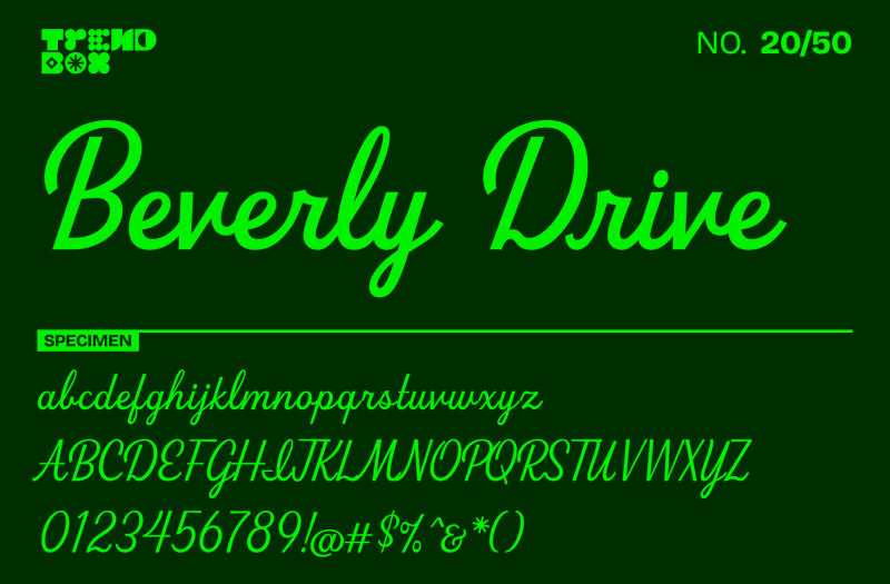 Beverly Drive Right, crafted by the brilliantAmy Hood of Hoodzpah, is a stunning addition to their collection of retro-inspired fonts. Known for their nostalgic yet contemporary typefaces like Lone Pine and Redondo Ave, Hoodzpah once again delivers with this elegant and versatile script font.