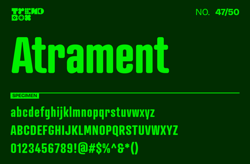 Atrament, designed by Tomáš Brousil from the Suitcase Type Foundry, is a bold display serif that demands attention. With its sharp contrasts and dynamic, exaggerated serifs, Atrament is a font crafted to make a statement in headlines, posters, and editorial layouts.