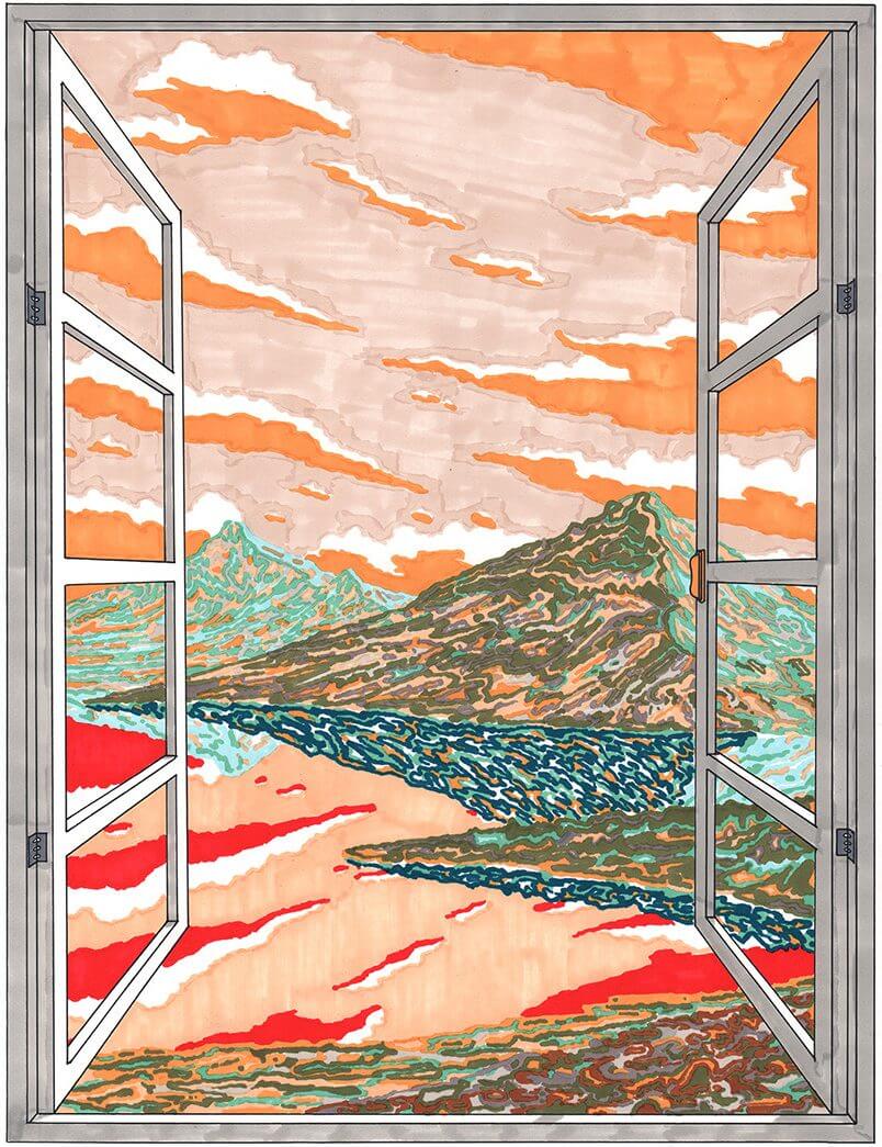 A common thread from Liam's comics to his standalone illustrations is his attention to detail, which creates self-contained visual narratives. Whether it's characters on a balcony, a solitary car on the roadside, Yayoi Kusama-inspired mushrooms and pumpkins, or the design of a rug in someone's apartment, each illustration hints at a story.