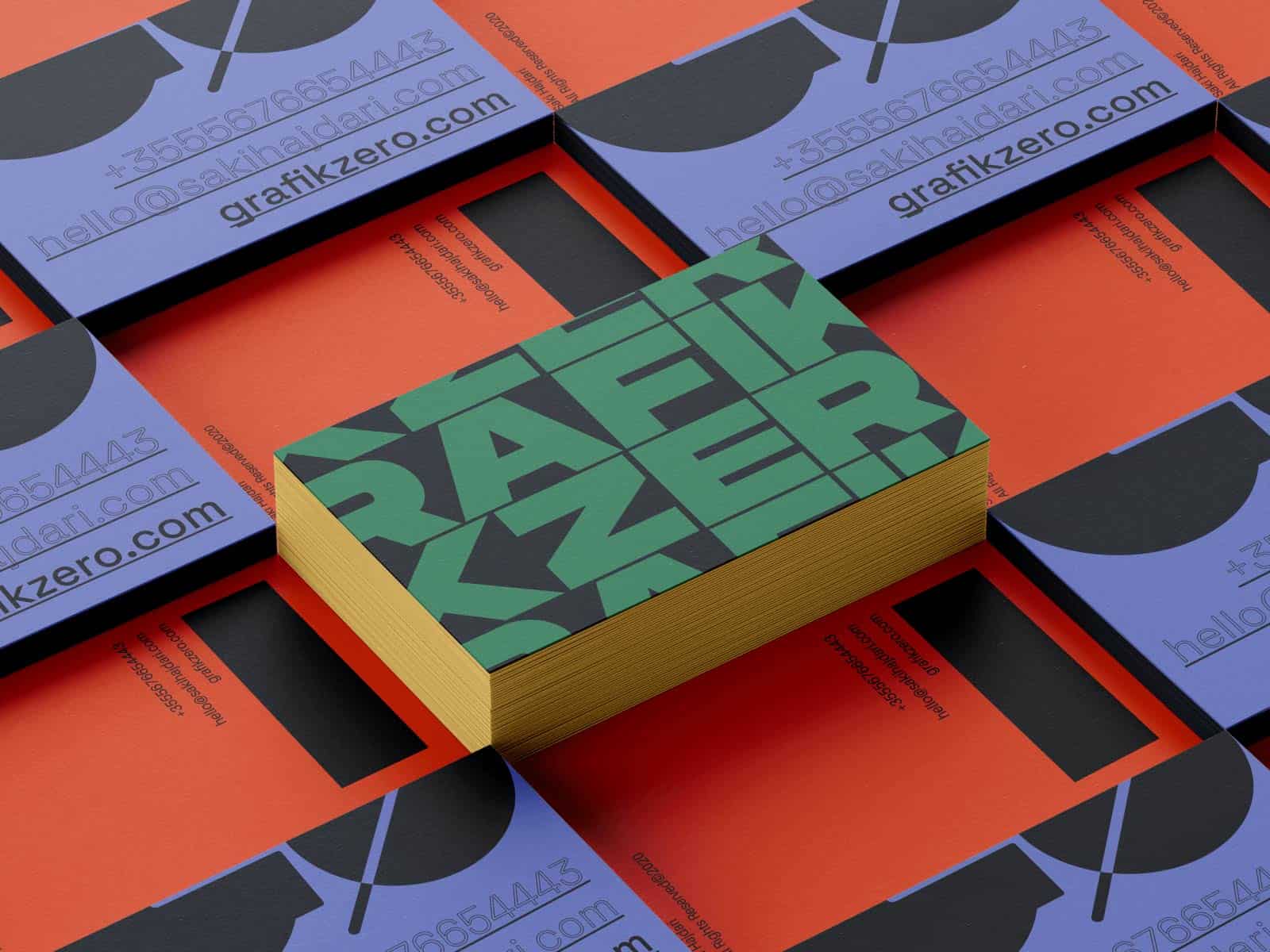 Another extended typeface that’s used to fill up the frontside completely. The brand’s name ‘Grafik Zero’ isn’t legible in the repetitive lines of text but this doesn’t always need to be if somewhere else on the card it’s being communicated clearly what the brand’s info is. The combination of a bold display font, a sans-serif body typeface, the color palette, painted edges, it just works.
